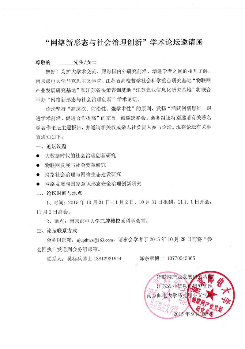 为扩大学术交流、跟踪国内外研究前沿、增进学者之间的相互了解,太阳成集团tyc234cc、江苏省高校哲学社会科学重点研究基地“物联网产业发展研究基地”和江苏省决策咨询基地“江苏农业信息化研究基地”将联合举办“网络新形态与社会治理创新”学术论坛。