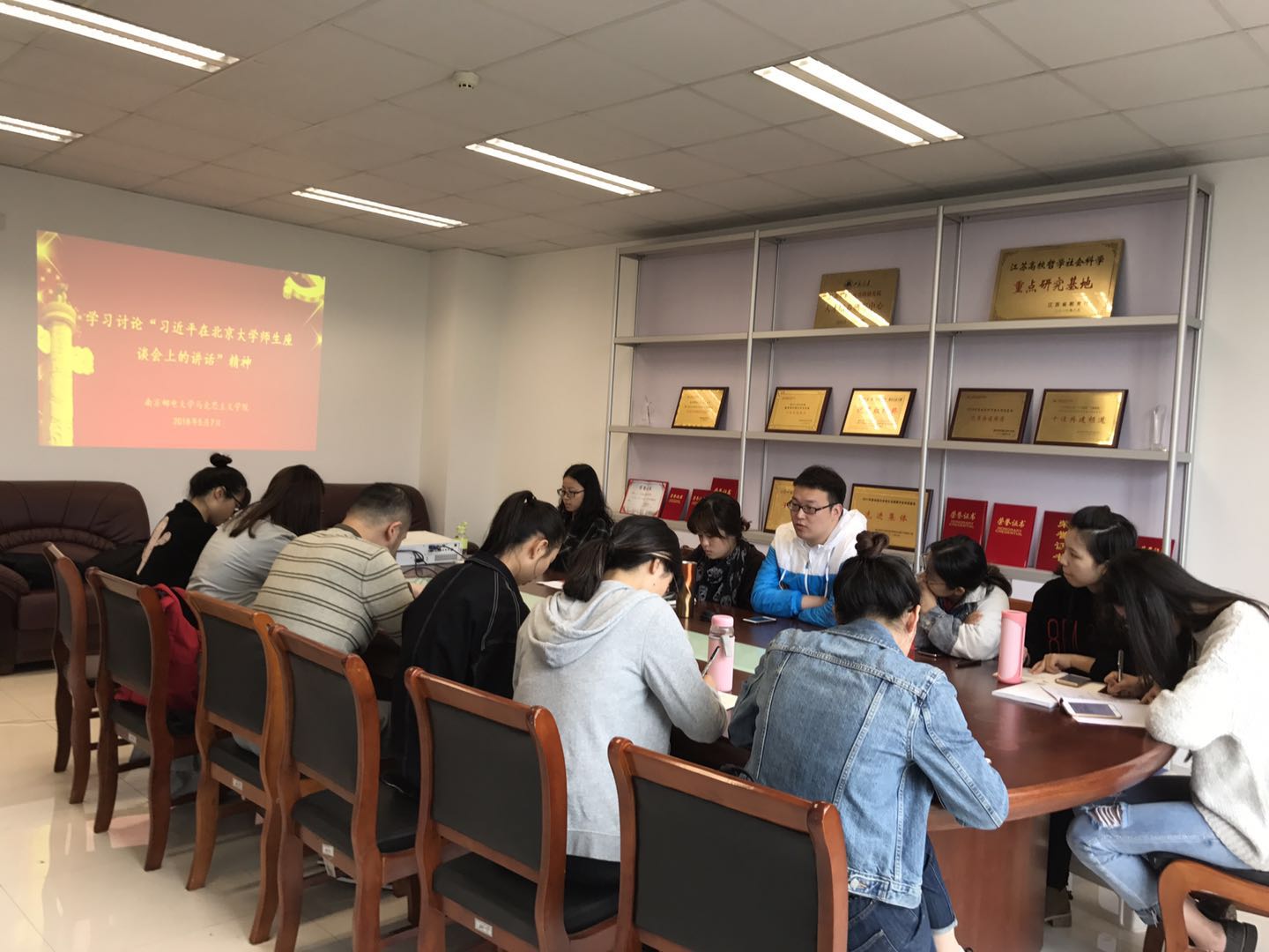 5月7日上午,太阳成集团tyc234cc组织全体研究生学习讨论今年五四前夕“习近平总书记在北京大学师生座谈会上的讲话”精神,全体研究生和辅导员王老师参加了讨论会,讨论会由团支部宣传委员徐诺诺同学主持。