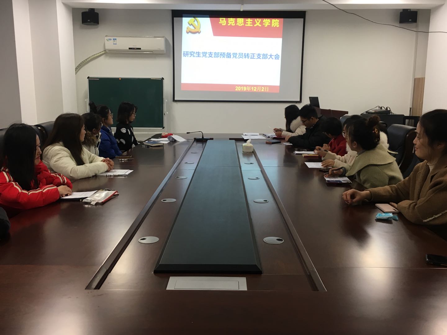 预备党员汇报完毕后,申请转正的两名同志回避,与会的正式党员同志对徐芸怡、朱玲琳同志是否转为正式党员进行了无记名投票表决。随后刘凤娟老师公布表决结果,与会正式党员一致同意推荐两名预备党员同志如期转正,并等待上级党组织批复。