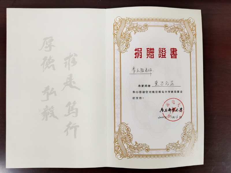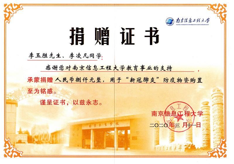 铭记党恩,大爱传承。作为一名中共党员和思想政治理论课教师,在课堂上,他是一位德高望重的老师,经常教导员工要有爱国精神、要善良淳朴、要与人为善,要向古代先贤学习,学习他们“长叹息以掩涕兮,哀民生之多艰”的爱国情怀、“人生自古谁无死,留取丹心照汗青”的舍生取义精神、“海纳百川,有容乃大,壁立千仞,无欲则刚”的高尚品德。在现实中,他注重知行合一以身示范,坚持与思想政治教育同行同向。在得知自己公司正在为返校师生准备防疫物资的时候,作为南邮大家庭的一份子,李老师决定向公司捐资一万元,助力公司购买防疫物资,以示个人的一份担当。大爱传承,作为父亲,李老师同时用自己的言行感染着就读于南京信息工程大学的女儿李凌凡同学,父女俩一起向南京信息工程大学捐款八千元,助力公司购买防疫物资。李老师说:“即使成不了参天大树,那就做一颗小草吧,默默无闻的小草也能装扮出碧绿美丽的春天。”