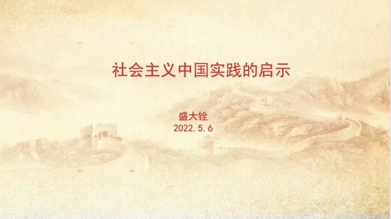 盛大铨老师围绕“社会主义中国的成立奠定了中华民族伟大复兴的基础”、“社会主义中国走过的历程是对科学理论的新贡献”、“社会主义中国选择的道路是国家走向现代化的新路径”,“社会主义中国坚持的制度是国家制度文明的新跨越”四个方面,对“社会主义中国实践的启示”这一主题进行了深入的理论剖析,并以近代以来中国历史中抗美援朝、三大改造以及改革开放为例,从实践维度具体而生动地诠释了从实践中得到的启示。