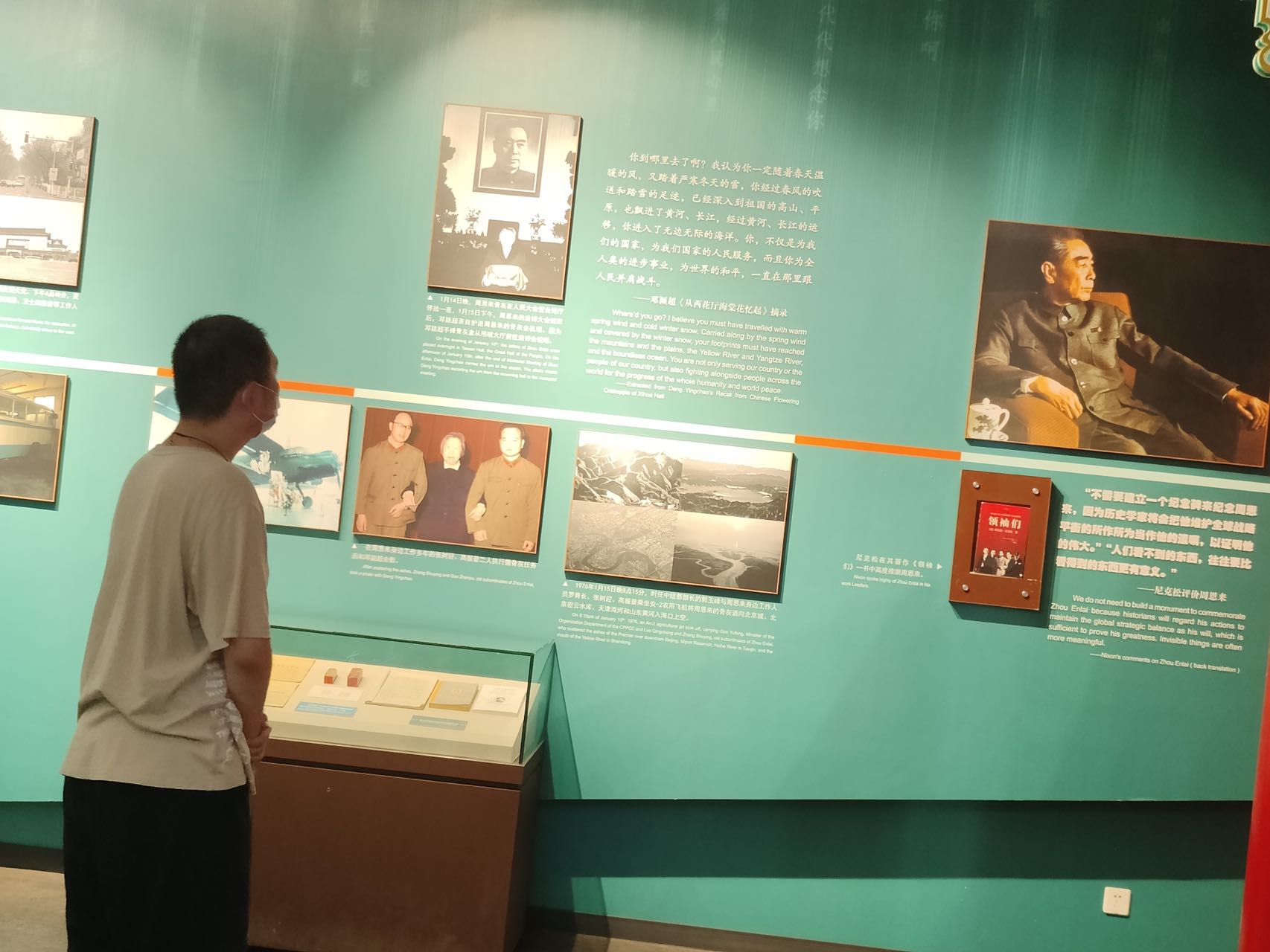 周恩来总理从1927年起就是党中央的核心领导成员, 中华人民共和国成立后长期担任党和国家重要领导职务,参与领导了革命和建设时期党的各项重大工作,为党和人民事业取得的每一个重大胜利付出了巨大心血,作出了卓越贡献。1921年春,在张申府、刘清扬的介绍下,周恩来加入中国共产党早期组织—— 巴黎共产主义小组,成为中国共产党党员。他作为我们党最早认识武装斗争重要性和最早从事军事工作的领导人之一,领导发动了八一南昌起义,为人民军队的诞生和壮大做出了重要贡献。在新民主主义革命时期,他积极领导开展党的秘密工作,为党的秘密工作的创建和发展做出了突出贡献。在苏区,为确立和维护毛泽东的领导和核心地位发挥了重要作用。新中国成立后,作为共和国总理的他,呕心沥血、日理万机,时刻为恢复发展国民经济和稳步推进社会主义建设事业贡献力量,并领导新中国外交工作,为推动新中国外交事业发展,提升新中国的国际地位做出了重要贡献。他的时间永远定格在1976年。他以彻底的唯物主义精神对待后事,为我们打破传统观念作出了表率。虽然他的身躯已经化为灰烬,但他的精神犹存,并已成为中华民族的宝贵财富,永远泽被后世!在看到一幅幅珍贵的照片,一个个震撼人心的历史故事,我的思绪仿佛跟随眼前的照片故事回到上个世纪,看到周总理恰同学少年,风华正茂,谱写苏区华章;烈士暮年,壮心不已,奏响新中国乐章。他的一生都在为党为人民奋斗不息,伟绩丰功昭日月, 甘霖玉露润神州。斯人已逝,海棠依旧。今年是2022年,周总理已离开我们整整四十六个年头了,可他那卓越的能力和崇高的人格会始终铭记在中国人民的心头,他无私奉献的精神依旧时刻激励着一代又一代满怀报国之志的热血青年不断前进。他的精神记载历史岁月,无论何时都在历史的丰碑上熠熠生辉。