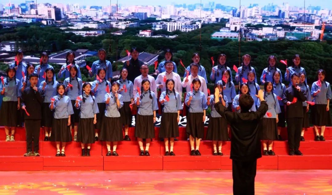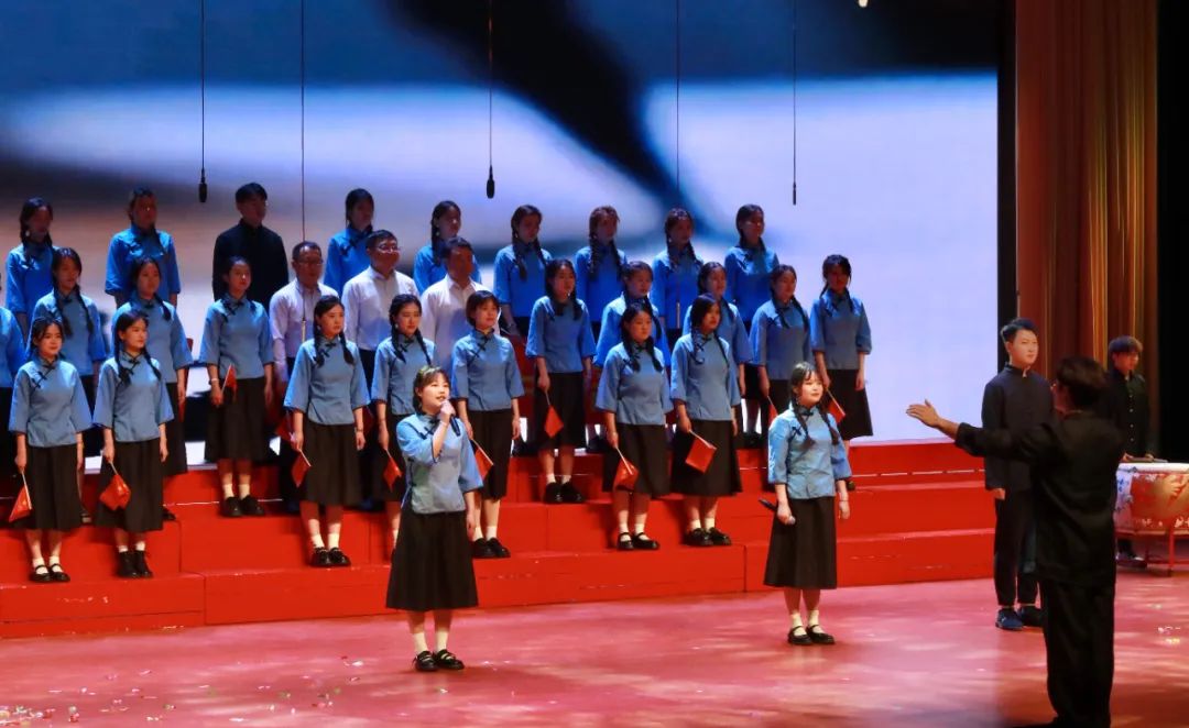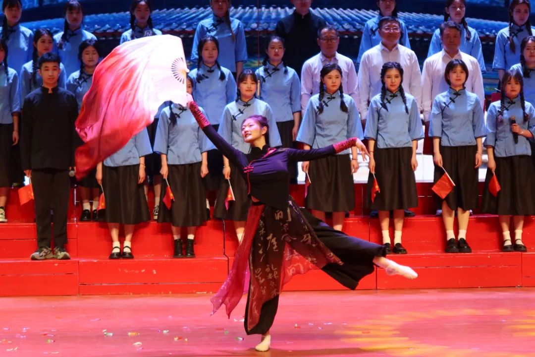 为更好地展现马院研究生的风采,公司研究生会在赛前积极组建研究生合唱队伍,选定歌曲并排练。同学们利用课余时间认真刻苦练习,黄洁老师多次莅临现场指导排练。在舞台上,马院研究生身着黑色中山装与蓝衫黑裙与三位公司领导们一同高唱歌曲《大中国》,“中国,祝福你,你永远在我心里⋯”,配合舞蹈、锣鼓和五星红旗等多种元素使舞台丰满唯美。马院师生的歌声洪亮有力,舞蹈生动热烈,似潺潺流水,如簇簇浪花,唱出了同学们的意气风发,也唱出了对新时代中华民族伟大复兴的歌颂,整个表演充分展现出马院学子们饱满的精神面貌。