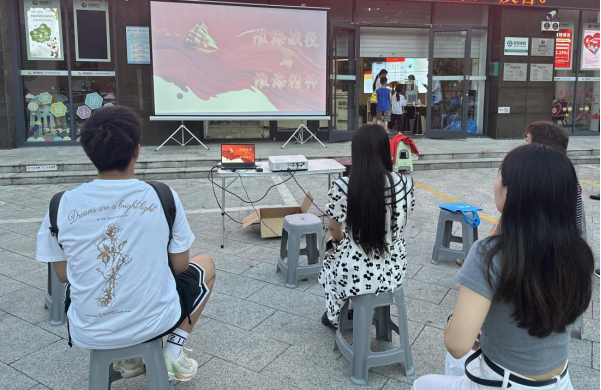 傍晚十分,步入彭城广场,面对熙熙攘攘的人群,实践团队在彭城广场东侧搭起淮海战役的海报,成员们以淮海战役为主题开展专题讲座活动,和来往的行人进行深入的交流,通过在投影仪上播放有关淮海战役的历史资料以加深他们对这方面历史的了解,并伴有实践团队成员的细致讲解,吸引了不少群众驻足围观和互动。
