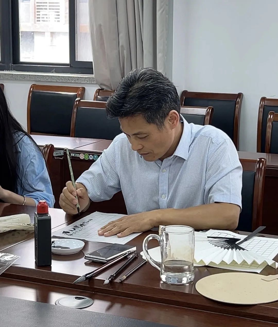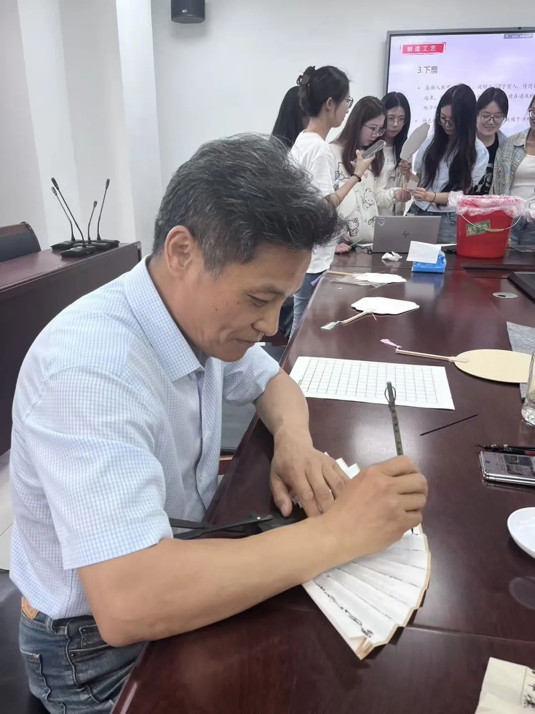 为了让同学们更好地了解漆扇文化意义,活动特邀嘉宾熊玉文老师为同学们带来了一场精彩绝伦的扇面书法艺术盛宴,熊老师挥毫泼墨,在素白扇面上题写了“端午安康”“事事顺遂”等吉祥寄语,并将书写的扇面书法赠送给在场同学,既让同学们感受到了传统文化的强大魅力,更拉近了师生之间的距离。