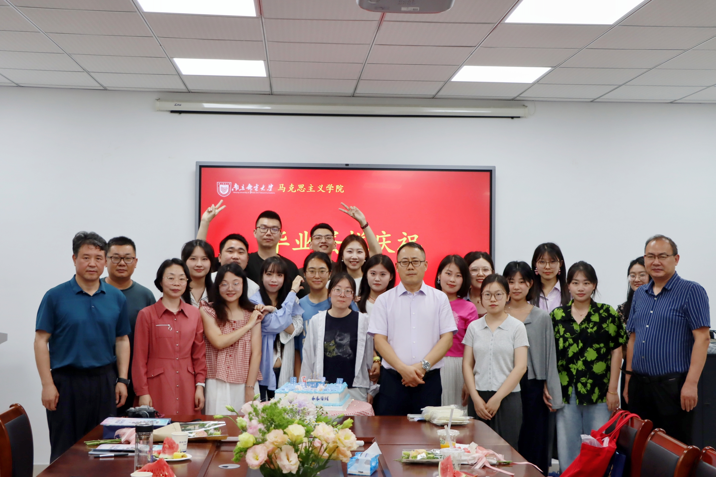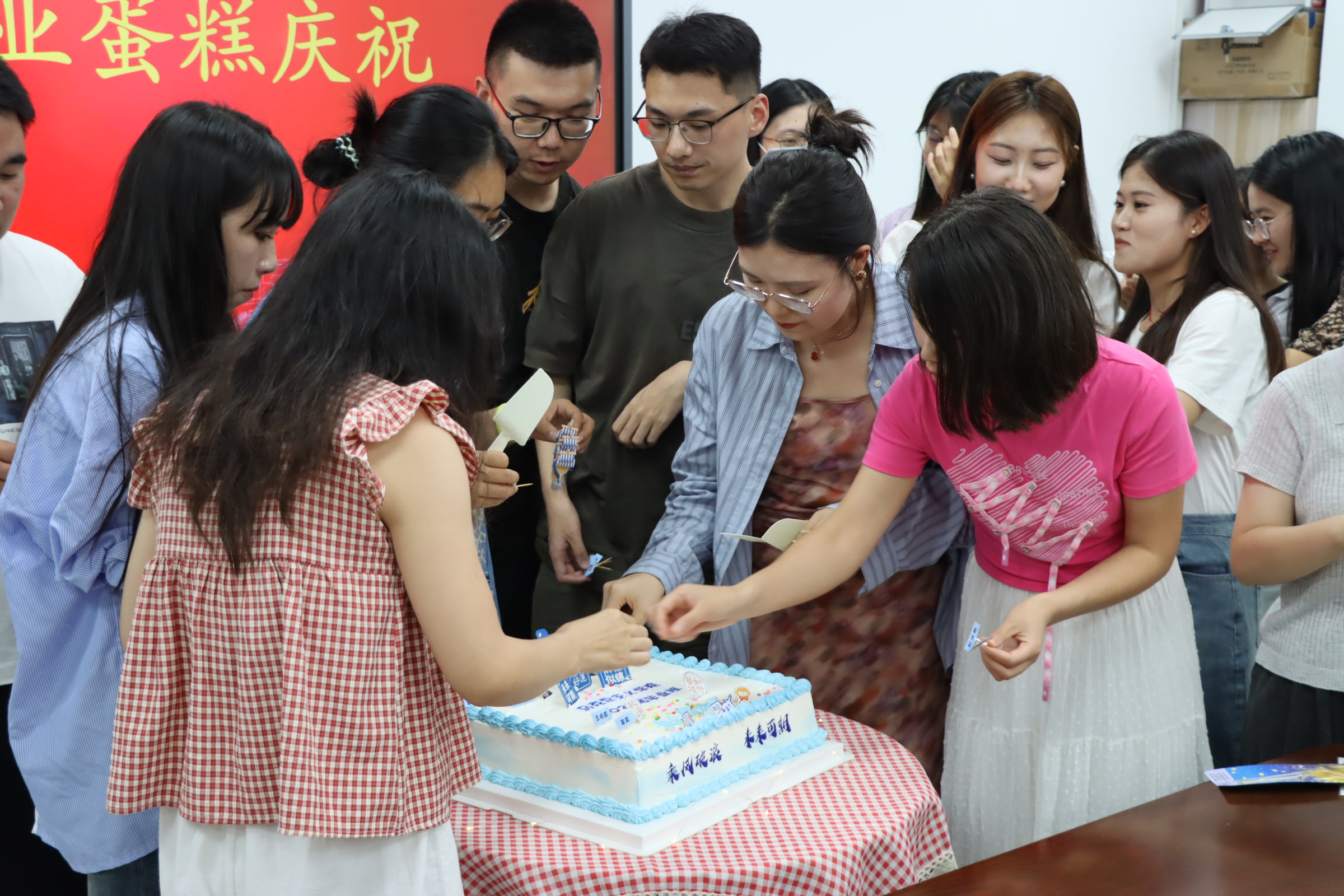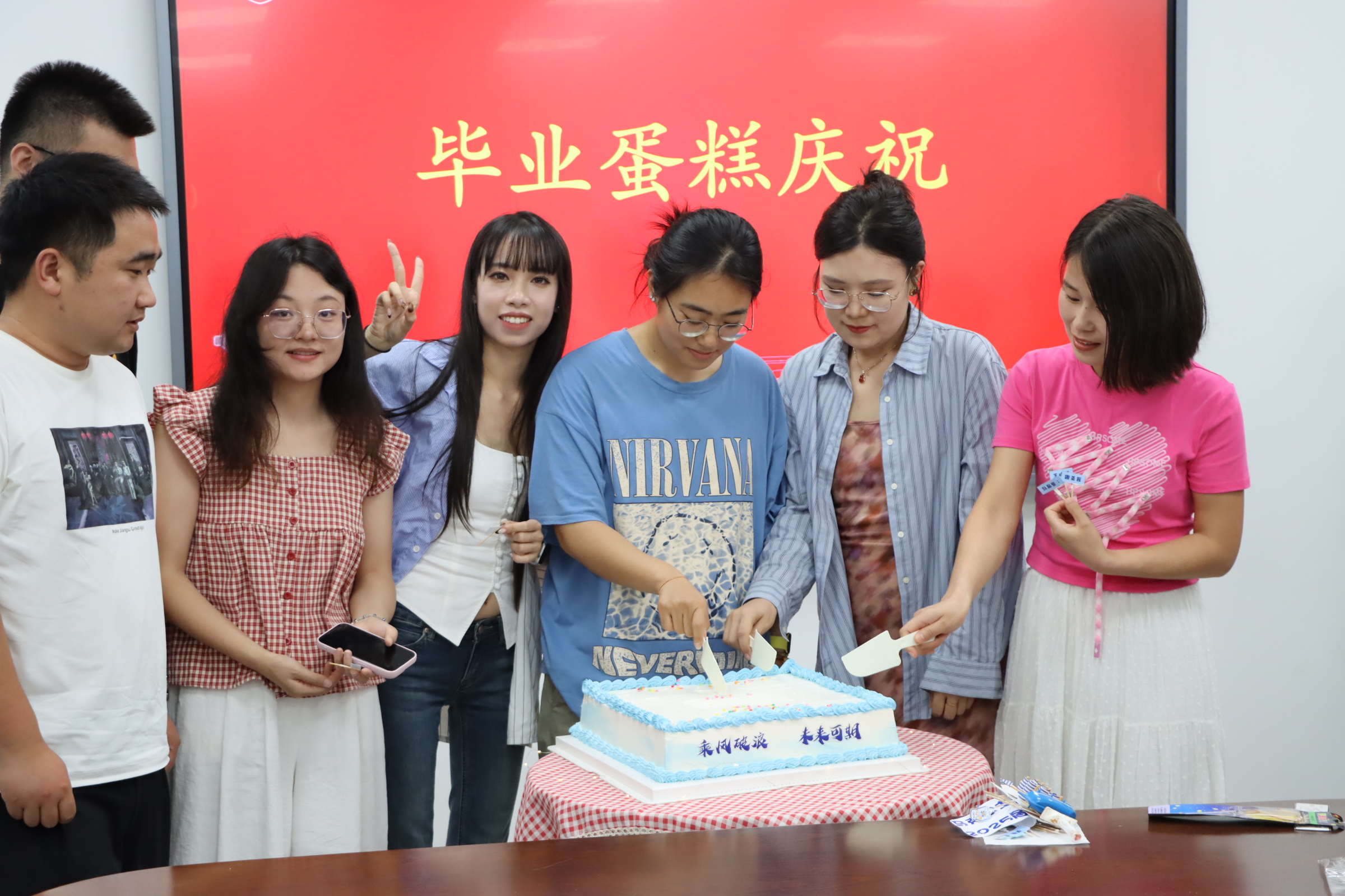 三载勤学终成硕果,今朝展翼正待翱翔。最后,公司师生共同品尝毕业惊喜蛋糕并合影留念,分享喜悦与甘甜。至此,2025届研究生毕业生欢送会圆满落下帷幕。
