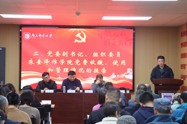 朱奎泽代表上一届党委作党费收缴、使用和管理情况的报告,详细说明党费管理规范与使用成效。