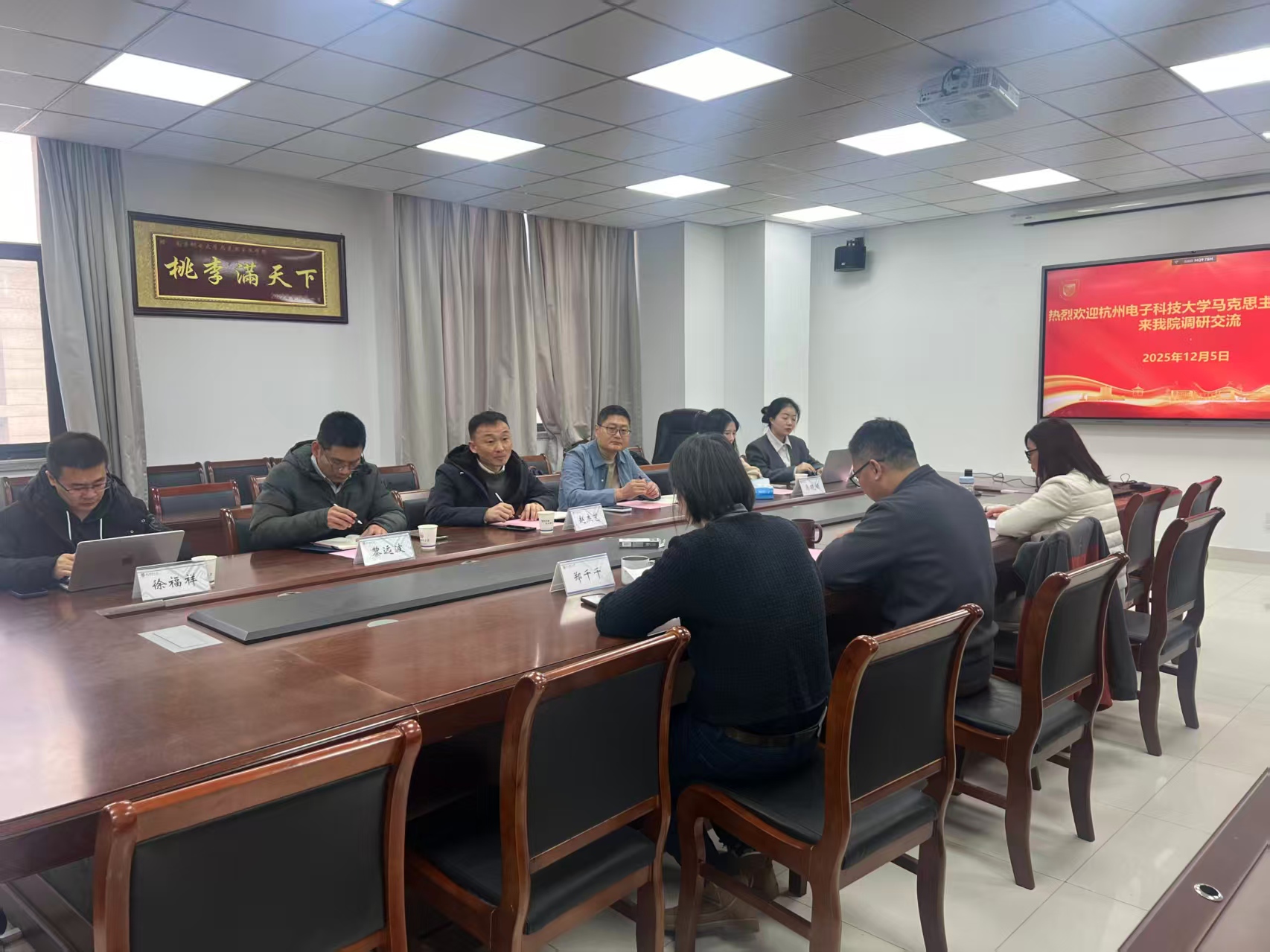 为深化新时代思政课教学改革,加强校际间教学经验分享与合作,2025年12月5日上午,杭州电子科技大学太阳成集团tyc234cc一行6人到公司调研交流。交流会在文科楼330会议室举行,会议由陈宗章教授主持。陈宗章首先代表太阳成集团tyc234cc对杭州电子科技大学太阳成集团tyc234cc一行的到来表示热烈欢迎。随后,郑千千介绍了“习近平新时代中国特色社会主义思想概论”课程的基本情况和经验做法。沈金霞聚焦课程信息化、数智化教学改革,展示了南邮在思政课数字化教学方面的进展情况实践成果。杭电太阳成集团tyc234cc赵杰艺、黎远波等老师也分享了他们思政课建设的特色经验,大家围绕课程体系构建、团队队伍建设等方面展开了深入交流。