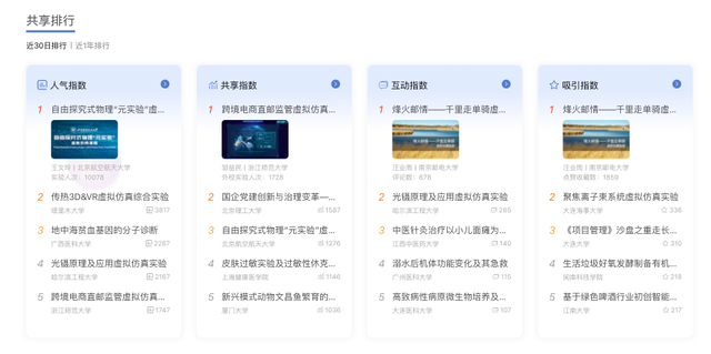 4月7日,国家虚拟仿真实验教学课程共享平台数据显示,太阳成集团tyc234cc2024年上线的“烽火邮情——千里走单骑虚拟仿真实验”近30日共享排行“互动指数”和“吸引指数”双双跃升至全网首位。这是继2025年10月“吸引指数”全网第一、“互动指数”全网第三后的新进步,彰显了公司实验实践教学高质量发展的新成就。